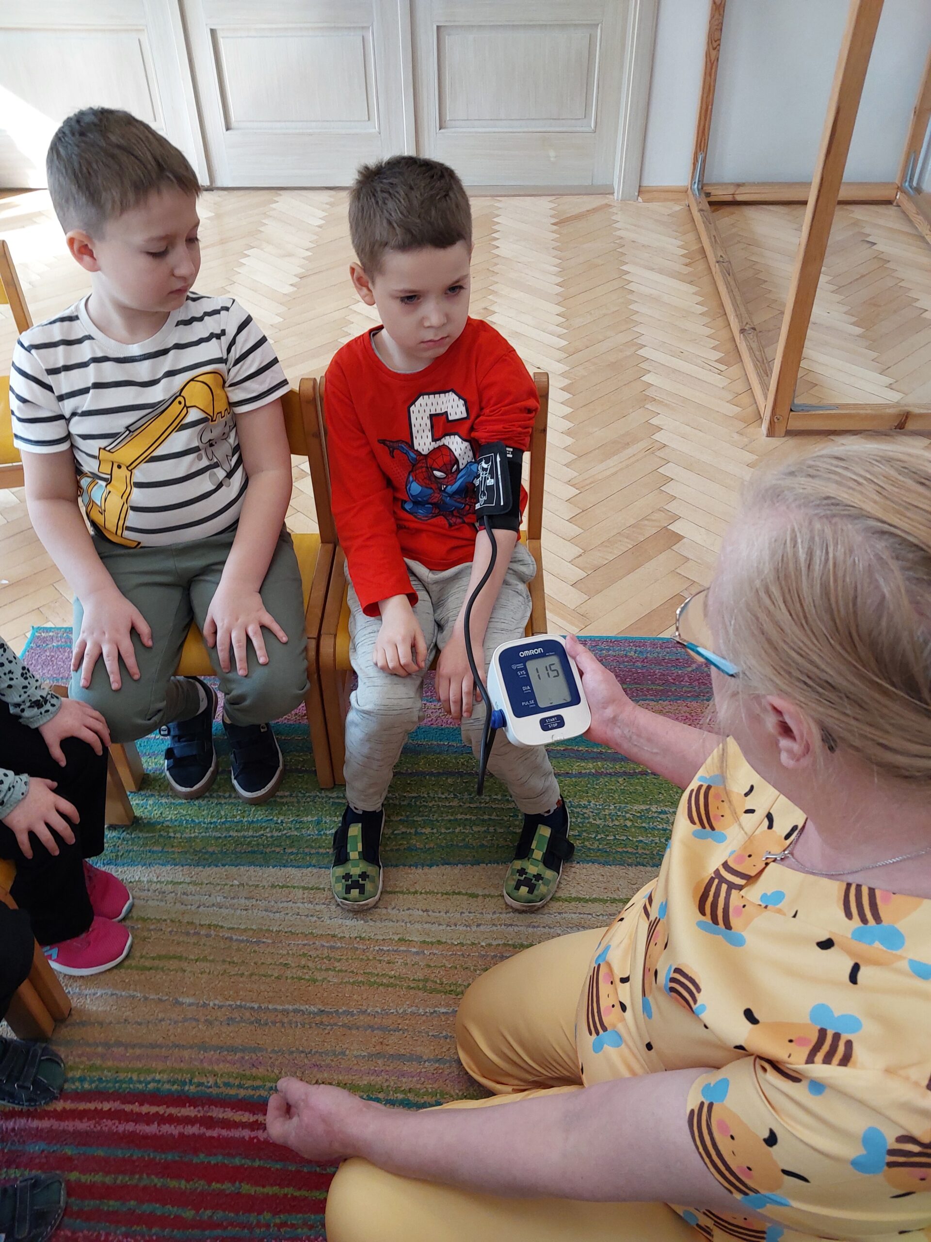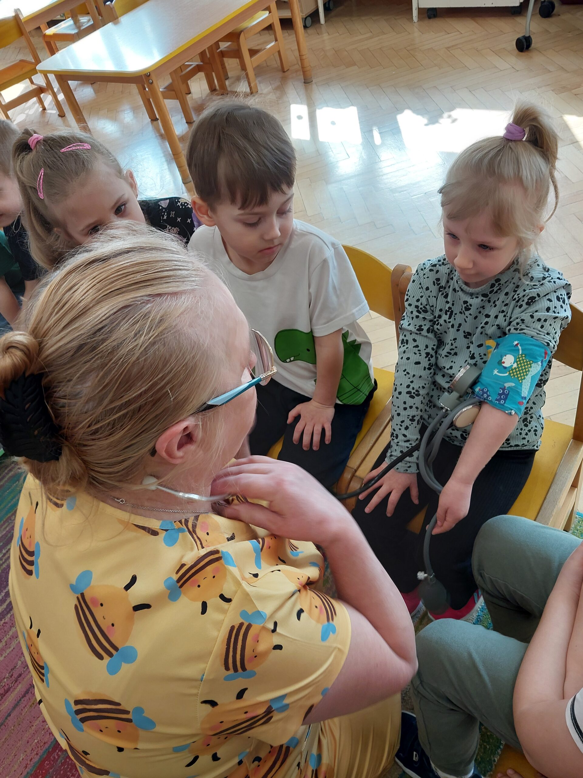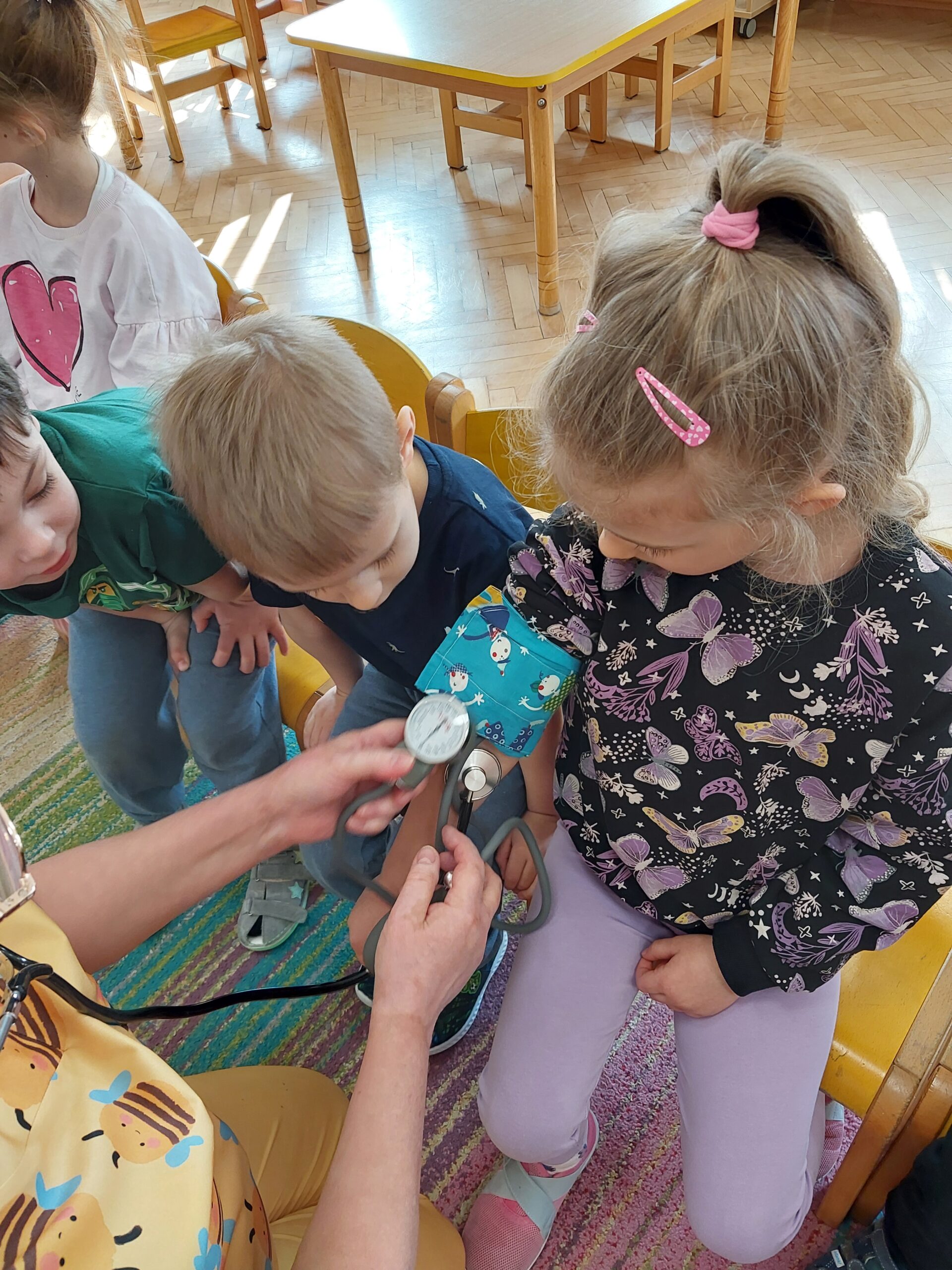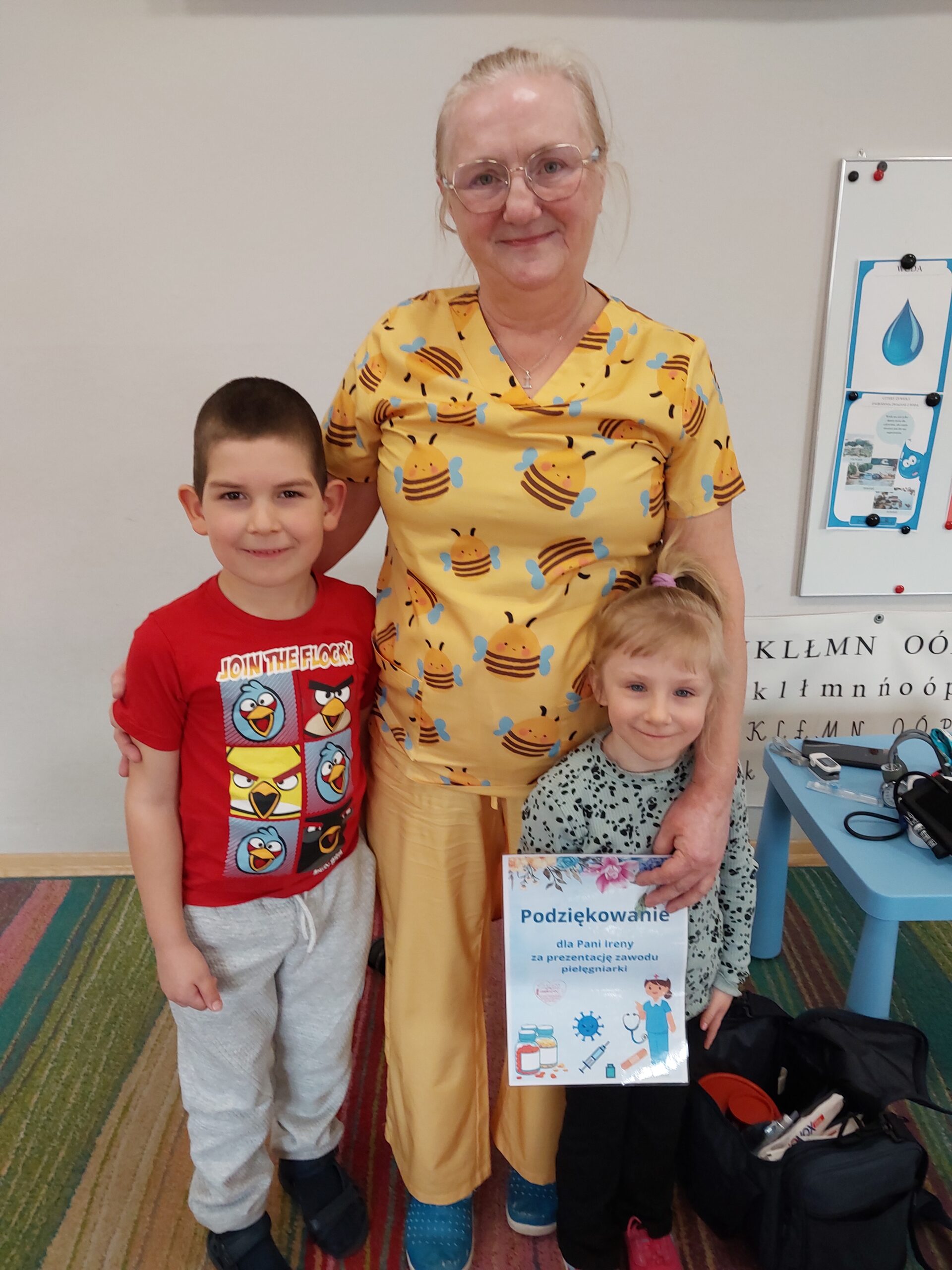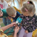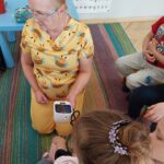 W czwartek Motylki gościły w swojej grupie niesamowitego gościa, Panią Irenkę – babcię naszego Dmytro, która z zawodu jest pielęgniarką. Opowiedziała dzieciom czym zajmuje się pielęgniarka oraz na czym polega jej praca. Pani Irenka zaprezentowała dzieciom przedmioty niezbędne do wykonania tego zawodu i wyjaśniła do czego służą. Podczas wizyty chętne dzieci miały mierzone ciśnienie oraz saturację. Dziękujemy za miłe spotkanie!