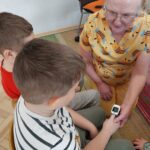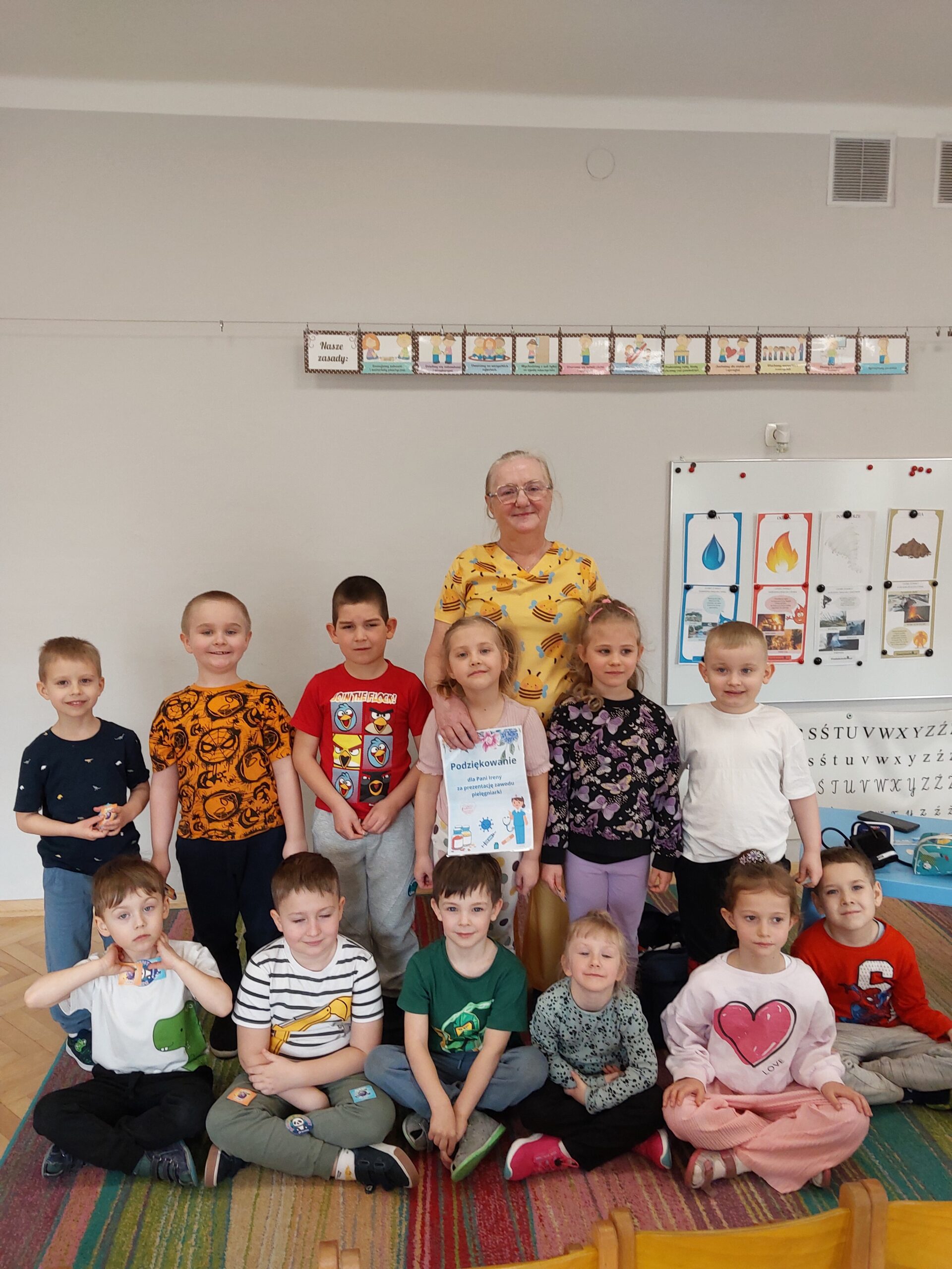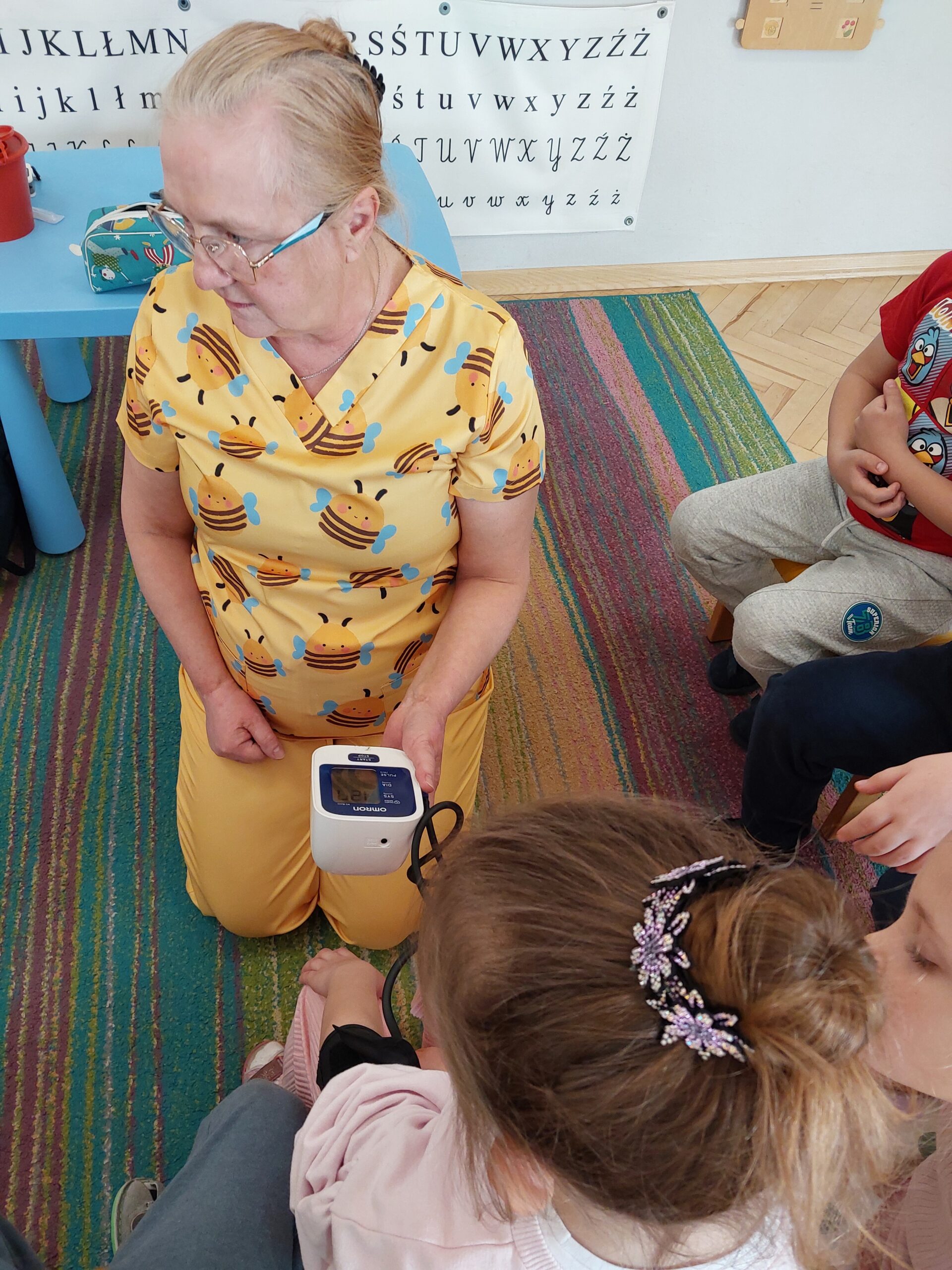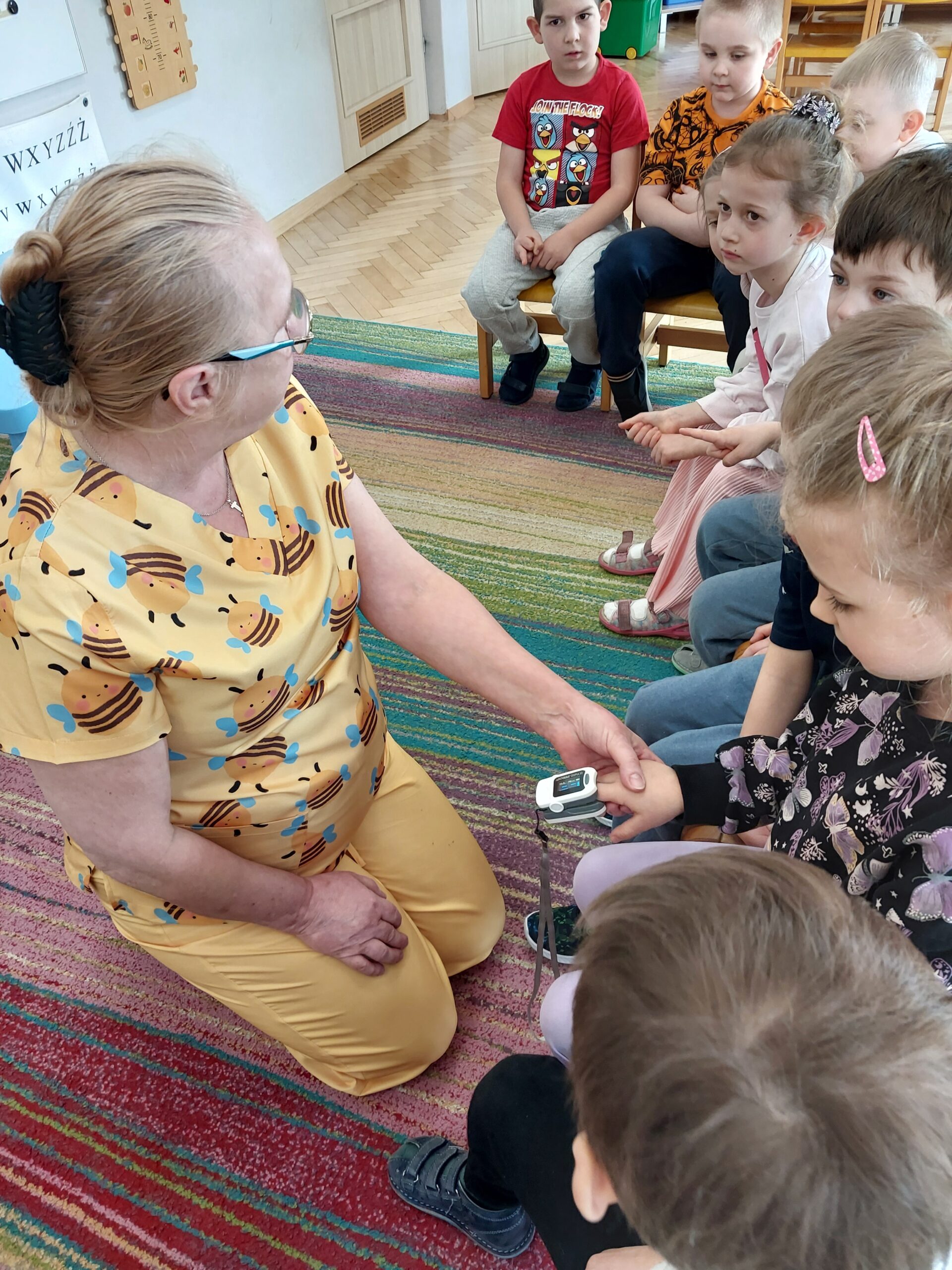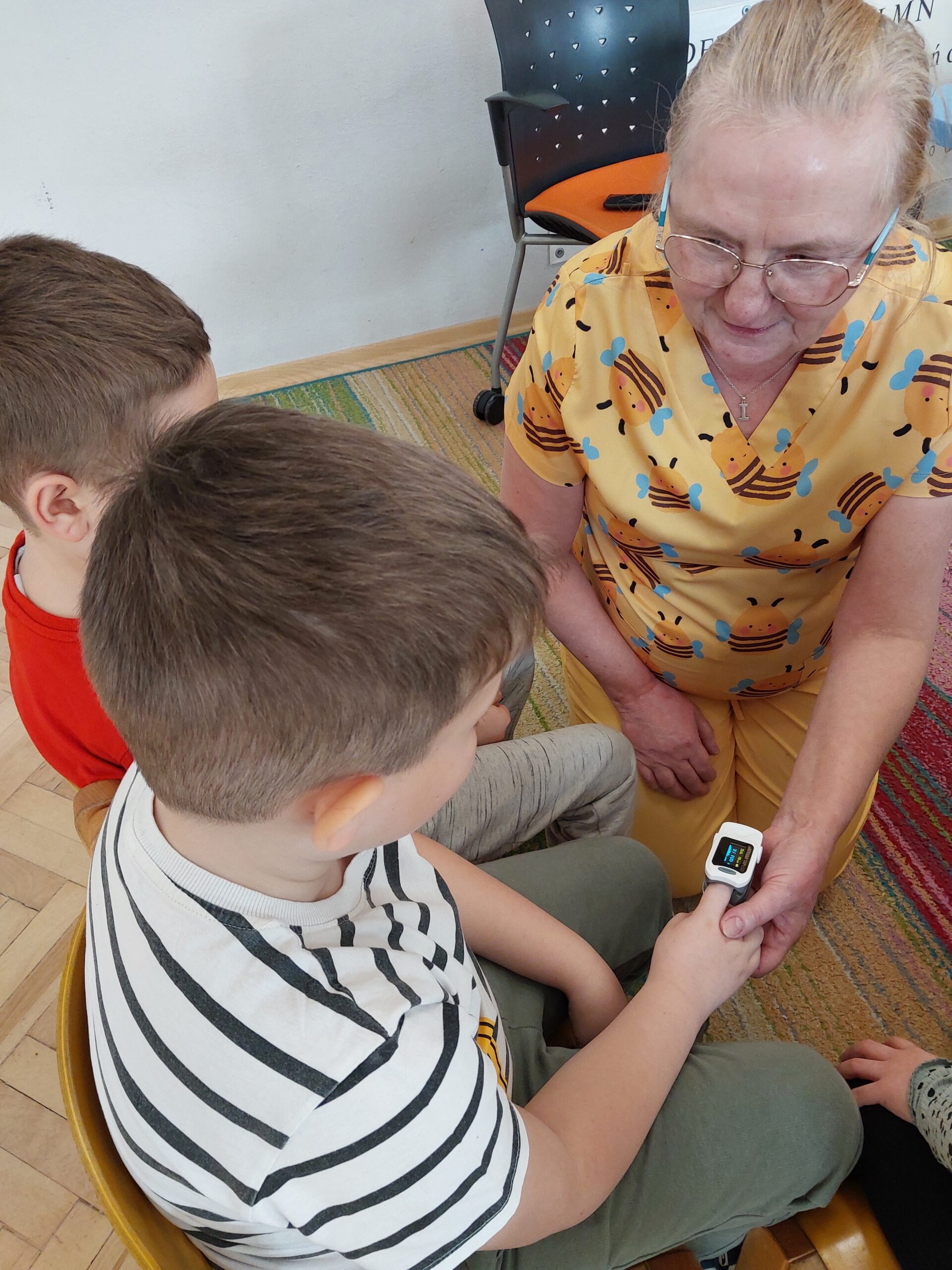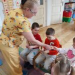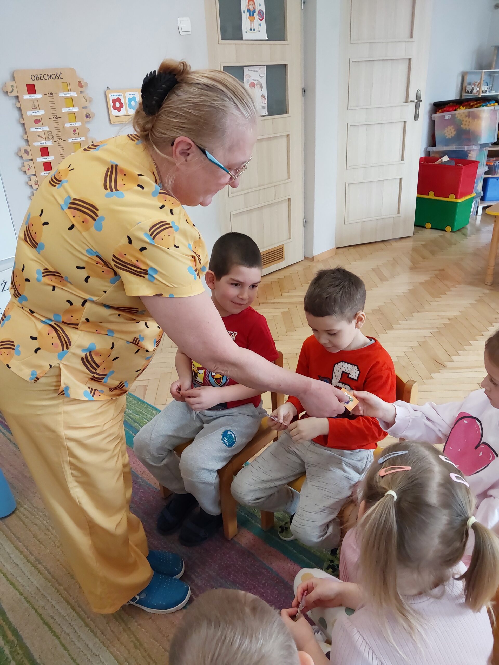 W czwartek Motylki gościły w swojej grupie niesamowitego gościa, Panią Irenkę – babcię naszego Dmytro, która z zawodu jest pielęgniarką. Opowiedziała dzieciom czym zajmuje się pielęgniarka oraz na czym polega jej praca. Pani Irenka zaprezentowała dzieciom przedmioty niezbędne do wykonania tego zawodu i wyjaśniła do czego służą. Podczas wizyty chętne dzieci miały mierzone ciśnienie oraz saturację. Dziękujemy za miłe spotkanie!